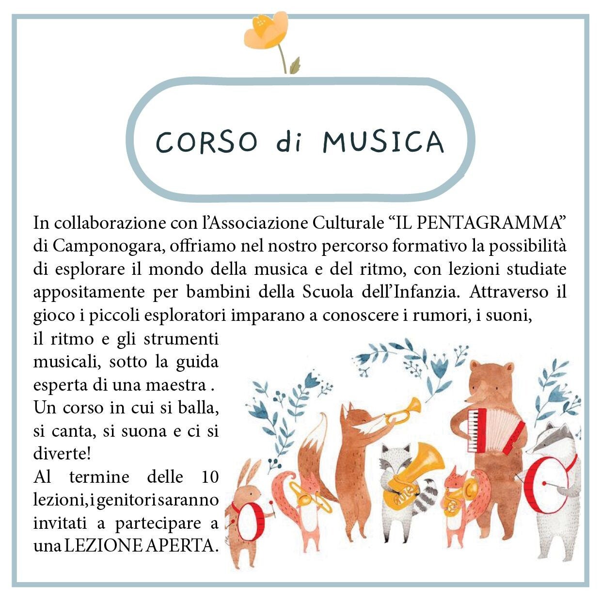 A supporto verranno proposte durante l'anno scolastico altre attività, anche con collaborazioni di esterni qualificati, che si svilupperanno sia per la durata dell'intero anno scolastico o lezioni/laboratori mirati di alcuni appuntamenti, così da dare diverse opportunità.
